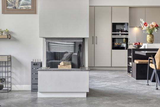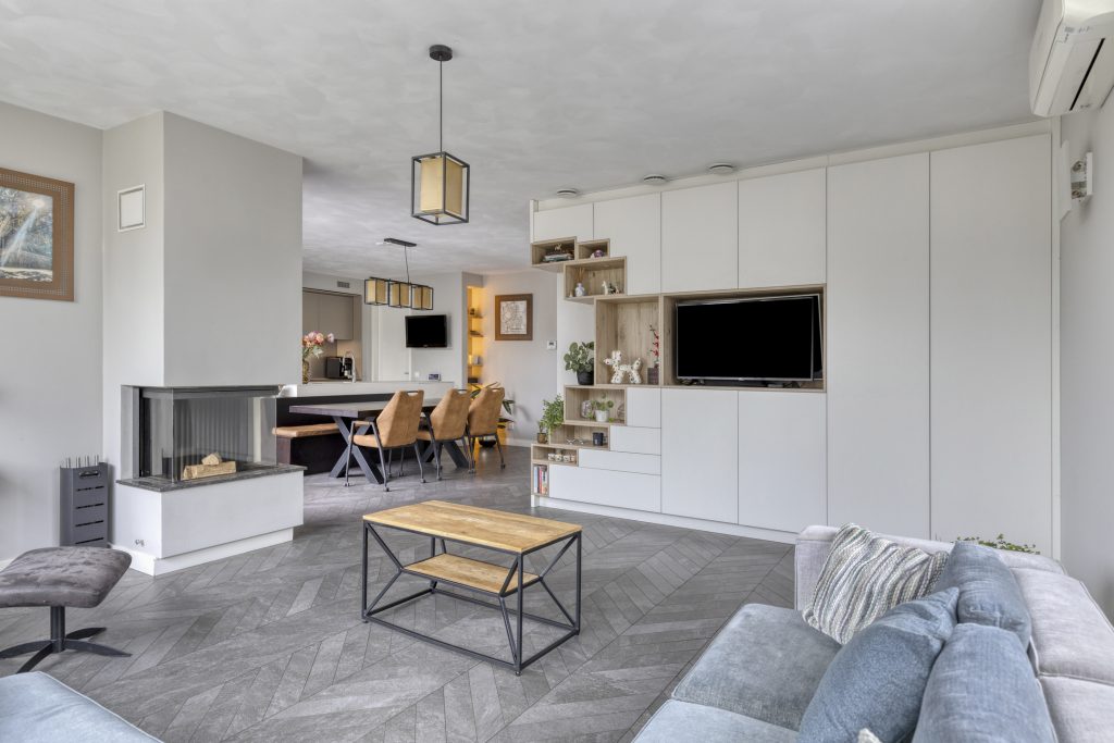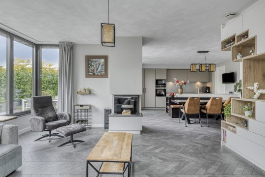Sfeervolle open living voorzien van een tegelvloer gelegd in Hongaarse punt welke doorloopt in de bijkeuken, keuken en de inpandige berging achter de keuken. De woonkamer geniet van een prettige en natuurlijke lichtinval door de diverse grote raampartijen en de schuifpui naar de achtertuin toe. De living biedt verder een ruim zitgedeelte met open haard, airconditioning en een maatwerk inbouwkast met opstelling televisie en opbergruimte. De woonkamer is afgewerkt met glasvlies wanden en een stucwerk plafond.