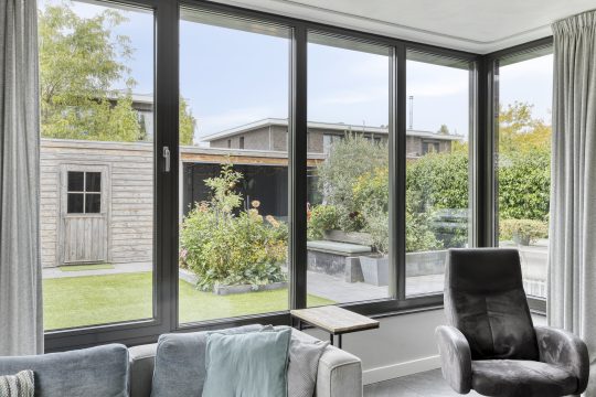 De woning is geheel voorzien van houten kozijnen met HR+++ glas op de begane grond en op de 1e verdieping voorzien van HR ++ glas met diverse draai-kiep ramen en schuifpui.