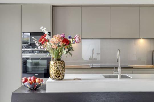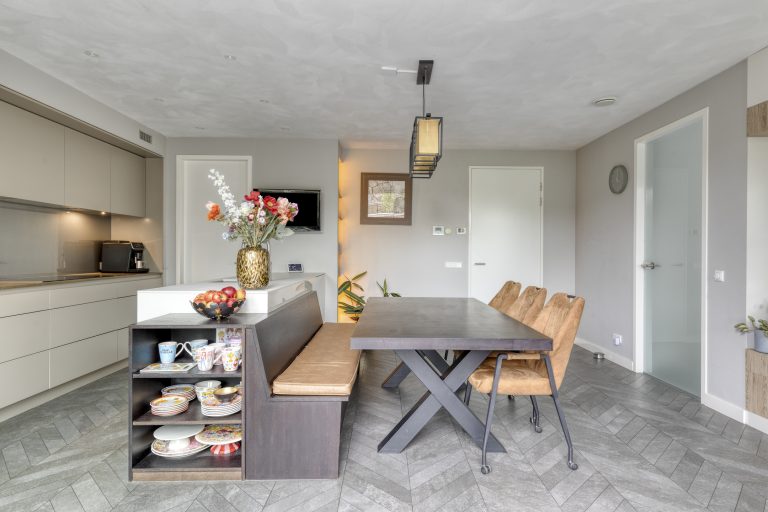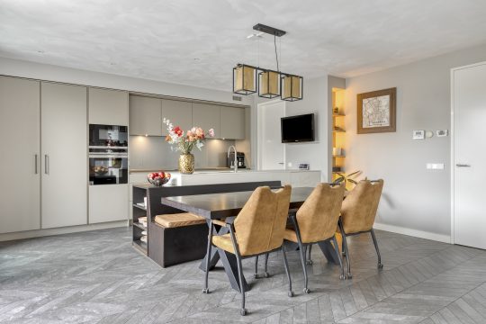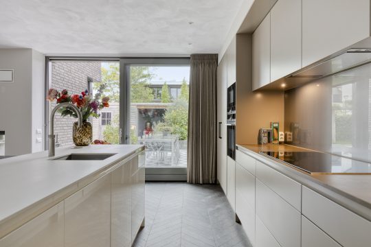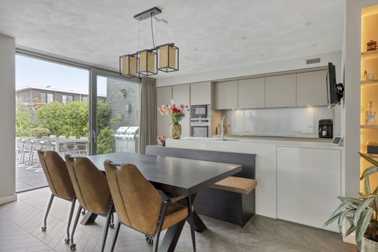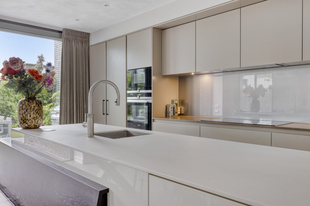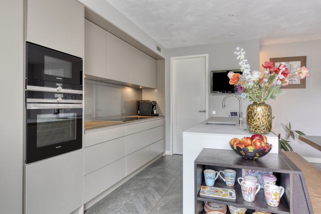 Moderne open (maatwerk) woonkeuken voorzien van een spoeleiland en hoge kasten met alle denkbare inbouw-apparatuur zoals; een inductie kookplaat met recirculatie afzuiging, koelkast, magnetron, oven met stoomfunctie. In het spoeleiland bevindt zich de vaatwasser en een spoelbak met Quooker. Aan het eiland is een maatwerk keukenbank bevestigd met op de kop een kast met legplanken. De keuken is verder uitgerust met diverse onder- en bovenkasten, lades, inbouwverlichting en afgewerkt met keramiek werkbladen.
