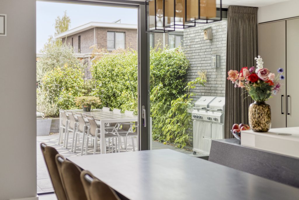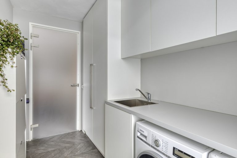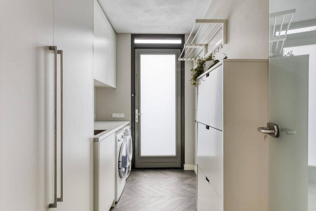 Vanuit de woonkamer toegang via glazen deur tot praktisch ingerichte bijkeuken voorzien van opstelling met waskoker, maatwerk inbouwkasten, werkblad met rvs-spoelbak, opstelling was-apparatuur, garderobe en een deur met toegang tot de achtertuin.
