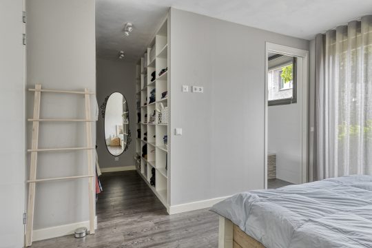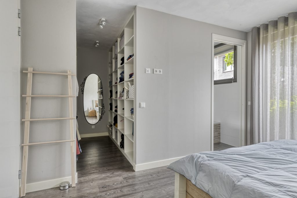 Royale masterbedroom voorzien van pvc-vloer, ruime walk-in closet met maatwerk inbouwkast, airconditioning, grote raampartijen voorzien van rolluiken en toegang middels een schuifdeur tot de badkamer.