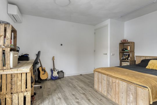 De 1e verdieping biedt ruimte aan 5 slaapkamers, ruime badkamer, inpandige berging voorzien van opstelling installaties en een separate toiletruimte. De gehele 1e verdieping is voorzien van glasvlies wanden en stucwerk plafondafwerking en een pvc-vloer die doorgelegd is naar alle kamers met uitzondering van de badkamer en toiletruimte.