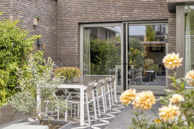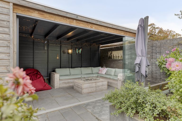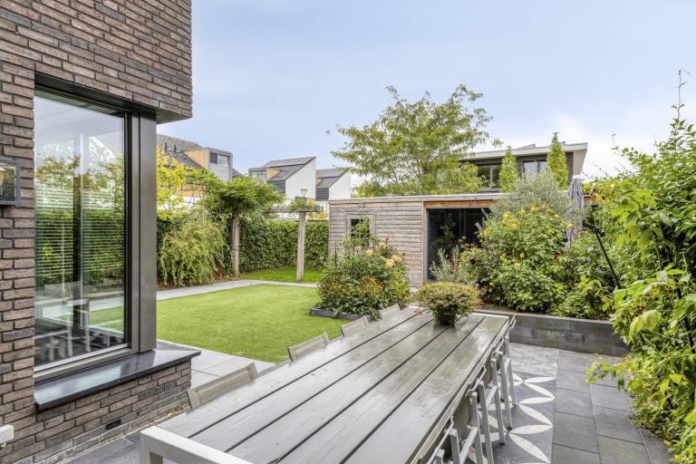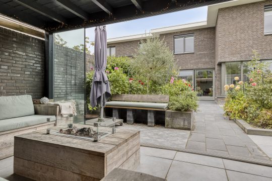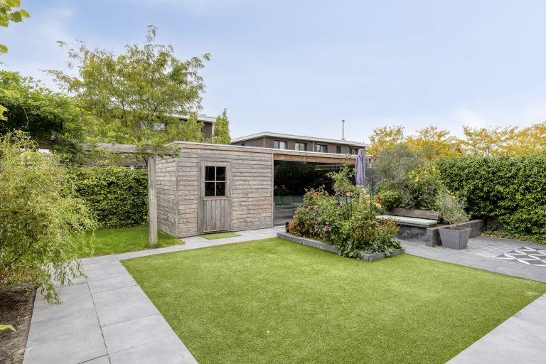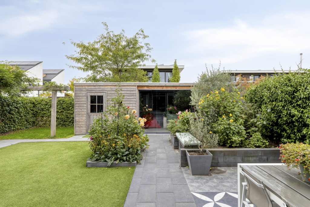 Sfeervol aangelegde achtertuin gelegen op het Zuidwesten en voorzien van diverse terrassen, sierbestrating, borders met vaste beplanting, gazon (kunstgras) zitbanken en een ruime buitenruimte voorzien van een aparte berging en buitenruimte met loungehoek welke geheel af te sluiten is met glazen panelen.