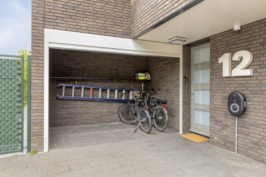 Via de eigen oprit met aansluiting voor laadpaal en toegang tot een poort naar de achtertuin, de inpandige (fietsen)berging en de overdekte entree van de woning.