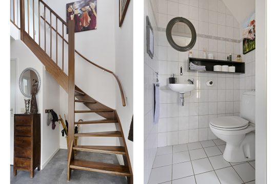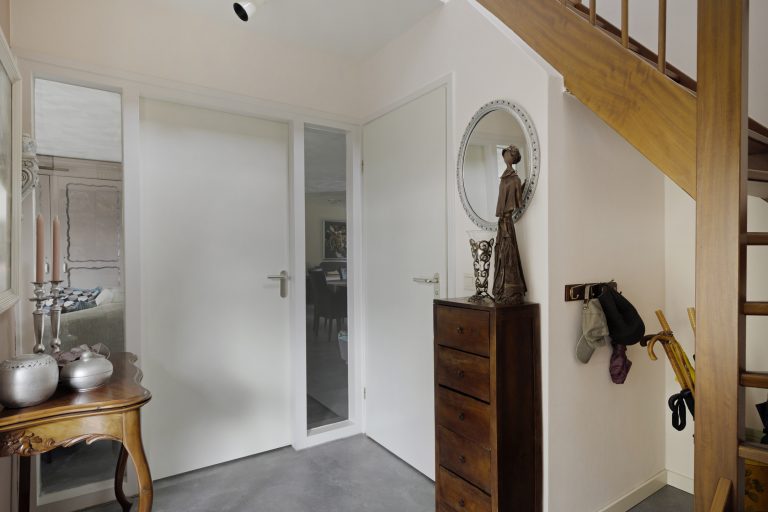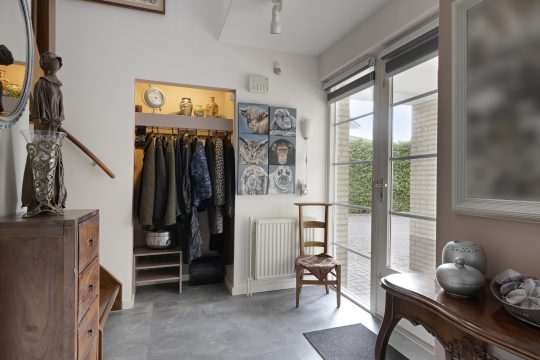 Royale entree/hal voorzien van een pvc-vloer welke door de gehele begane grond is doorgelegd met uitzondering van de toiletruimte, bijkeuken, serre en de garage. Verder voorzien van een vide, garderobekast, hardhouten trappartij, toiletruimte en via een breed deurkozijn met glas toegang tot de woonkamer.
