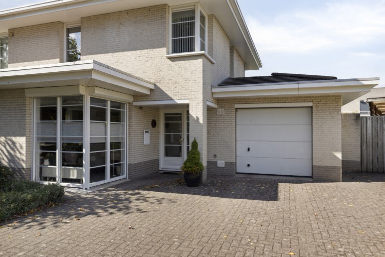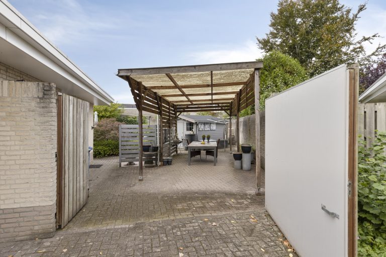 Ruime eigen oprit welke mogelijkheid biedt voor het parkeren van meerdere auto`s en via een poort toegang tot de achtertuin met overkapping voor eventueel stalling van een camper/caravan en via een elektrische roldeur toegang tot de inpandige garage.