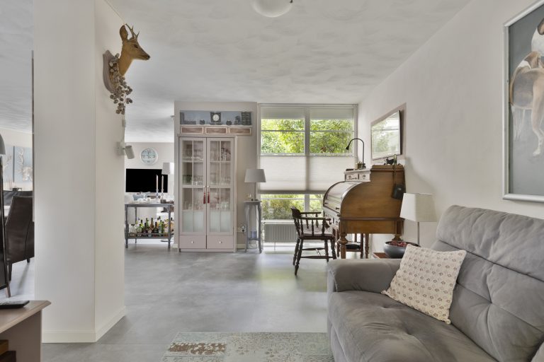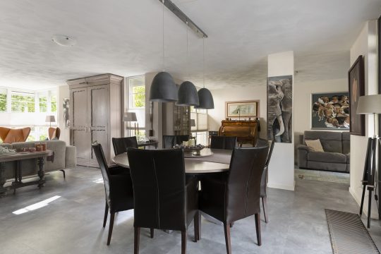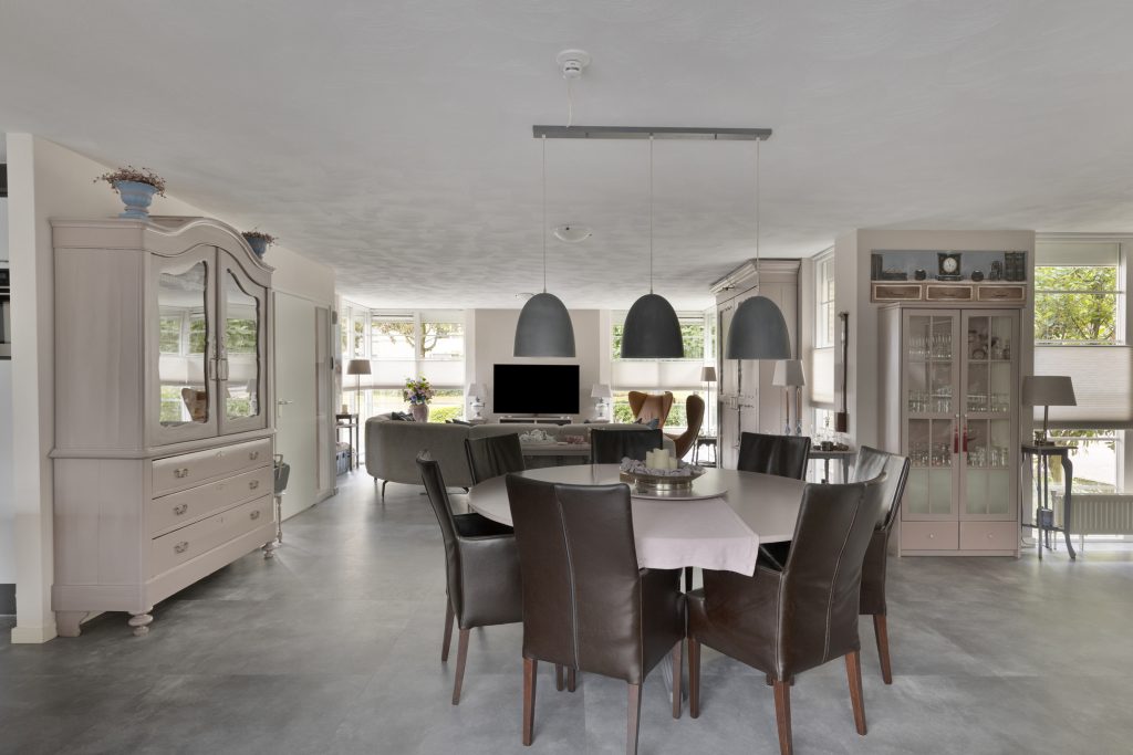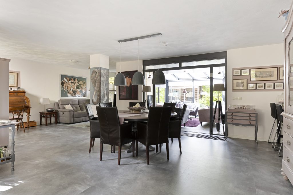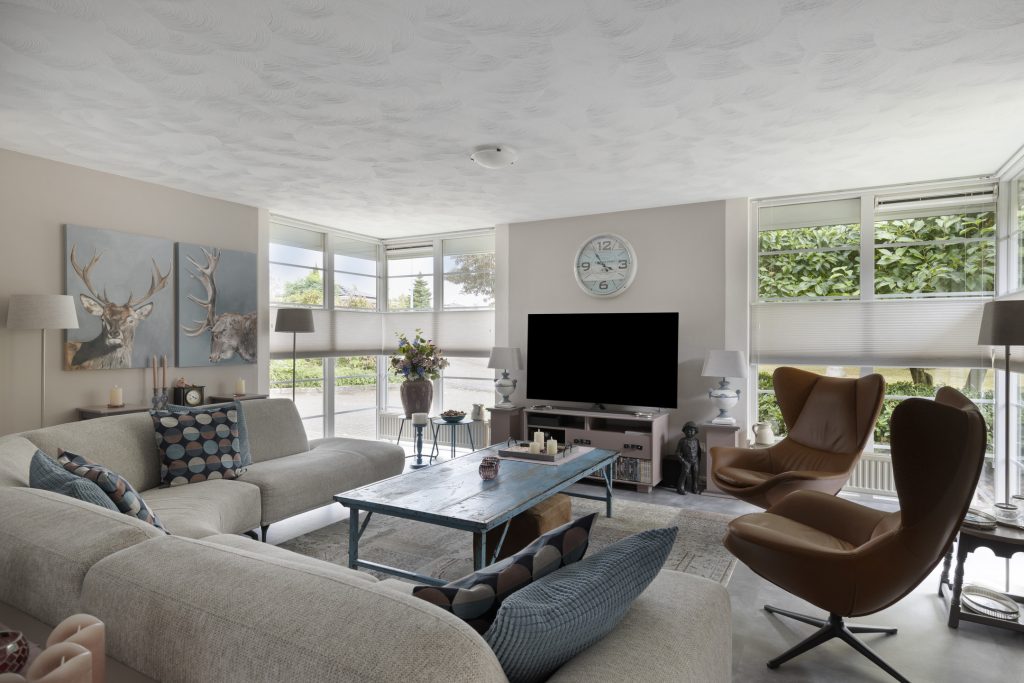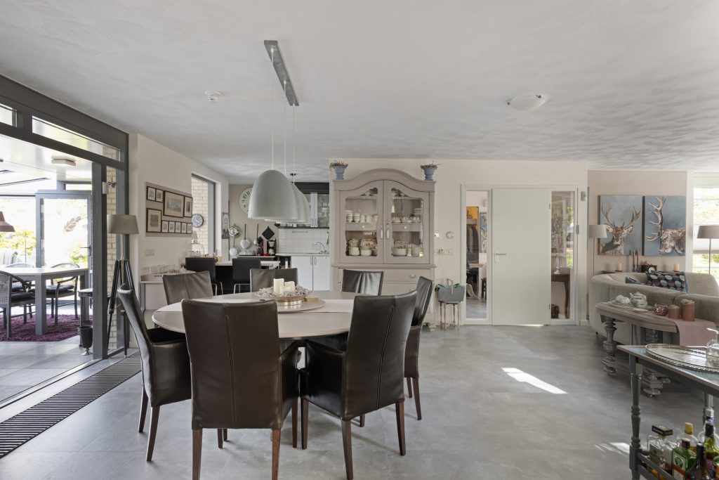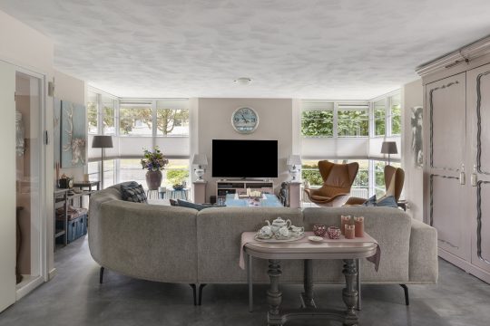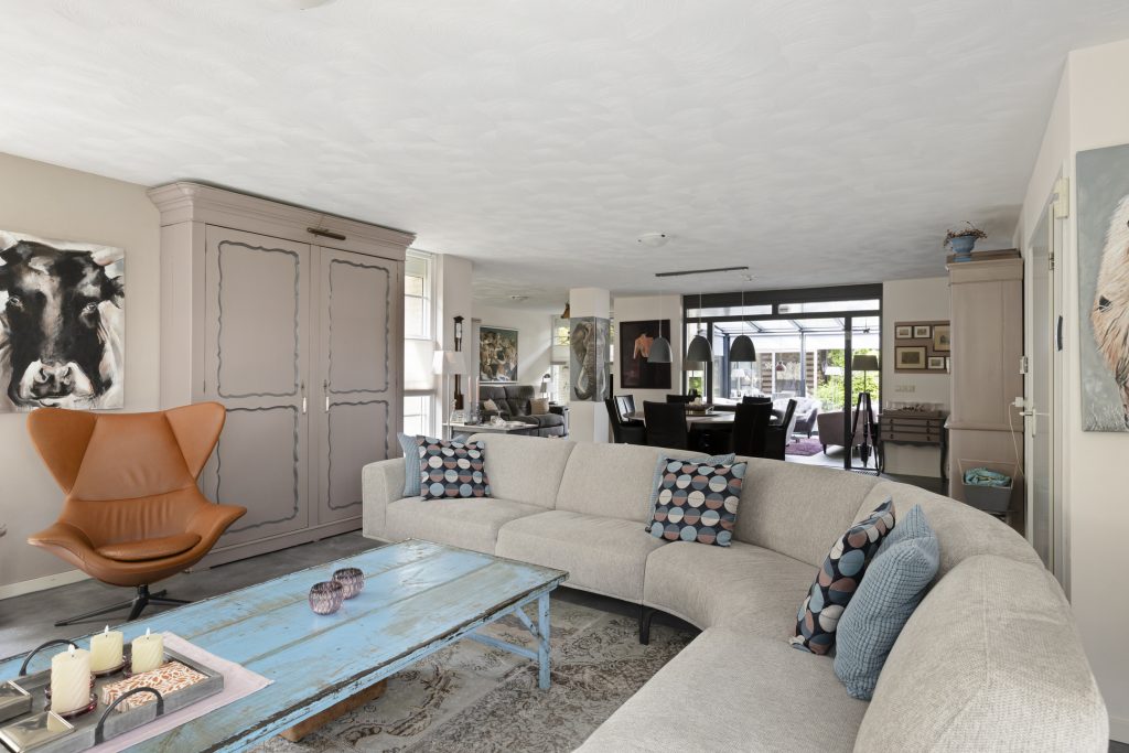 Sfeervolle royale woonkamer afgewerkt met stucwerk wanden en plafond. Verder beschikt de woonkamer over een convectorput, optimale lichtinval door diverse raampartijen en middels een open verbinding tot de uitbouw met serre met vanuit daar uitzicht op de achtertuin.