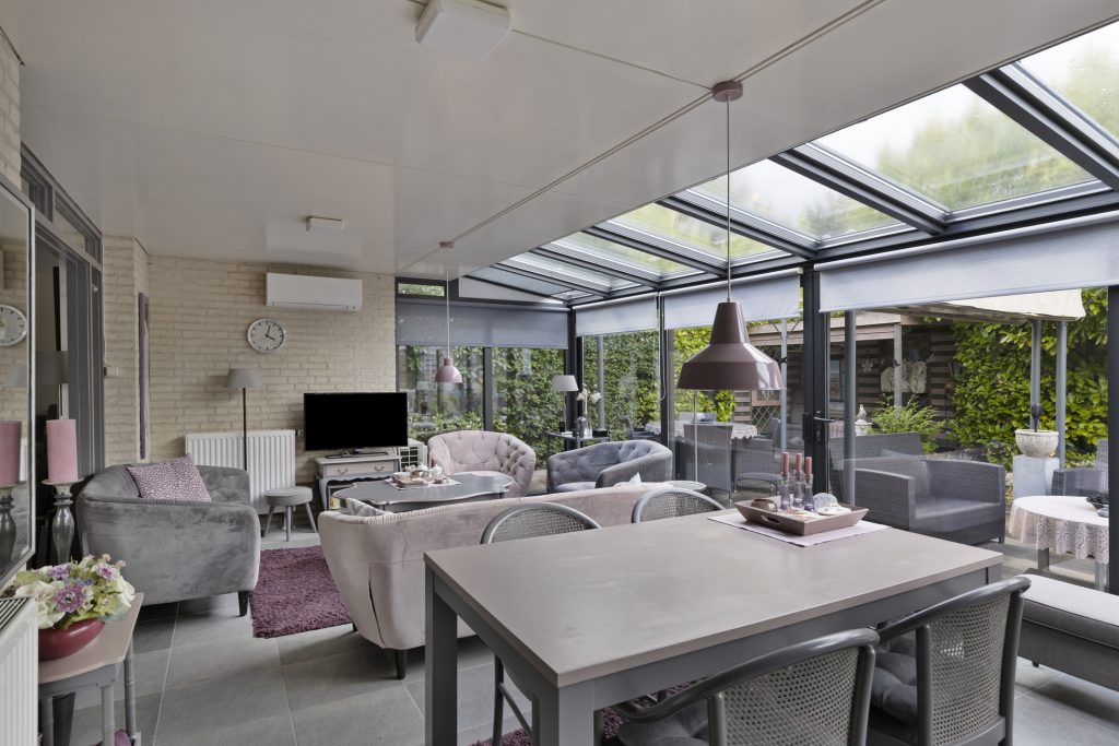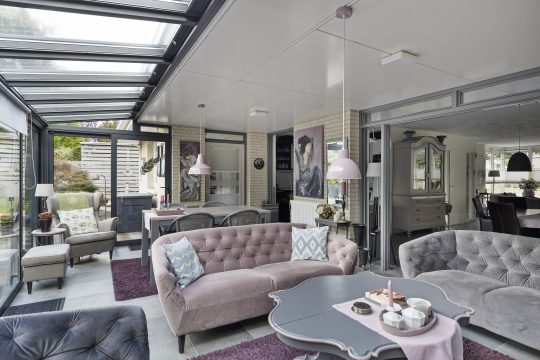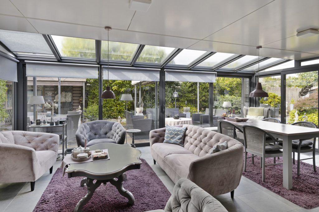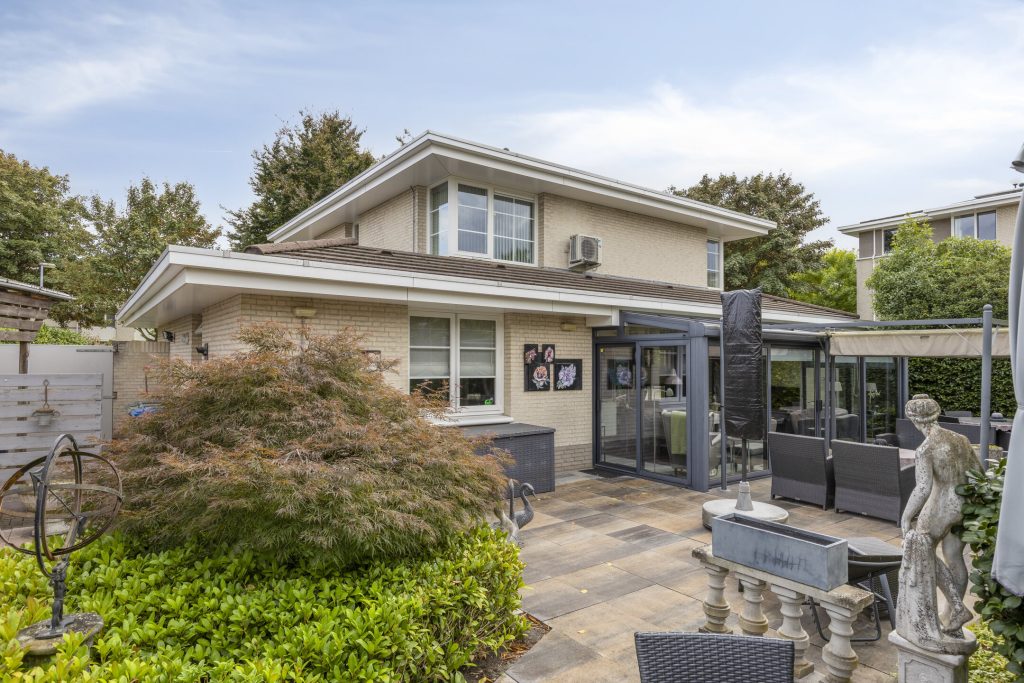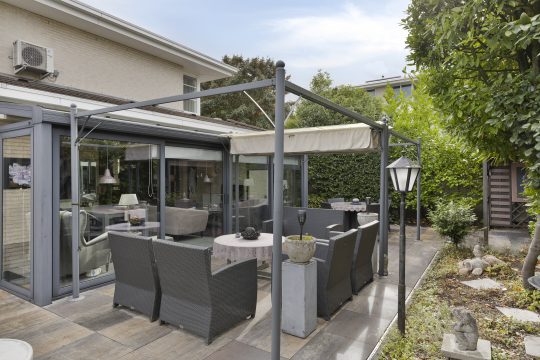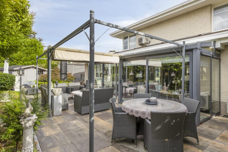 Vanuit de woonkamer te bereiken fraaie en ruime serre welke is voorzien van een tegelvloer, airco-unit en een schuifpui met toegang tot de achtertuin.