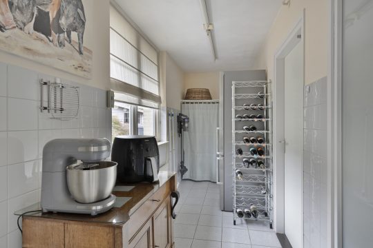Praktische betegelde bijkeuken v.v. stucwerk wanden/ plafond en tegelvloer. Verder bevindt zich hier de opstelling voor de wasmachine en droger en een deur naar de garage.