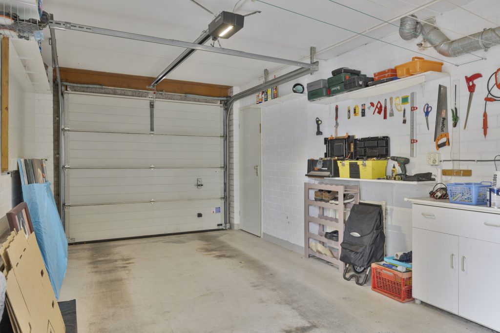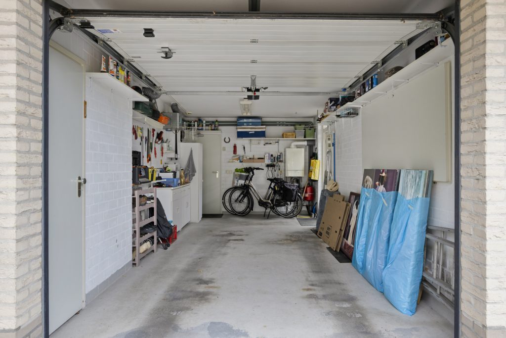Inpandig te bereiken garage voorzien van betonvloer, een elektrische roldeur, opstelling cv-combiketel, unit mechanische ventilatie, meterkast met uitgebreide groepenkast en een deur naar de achtertuin.