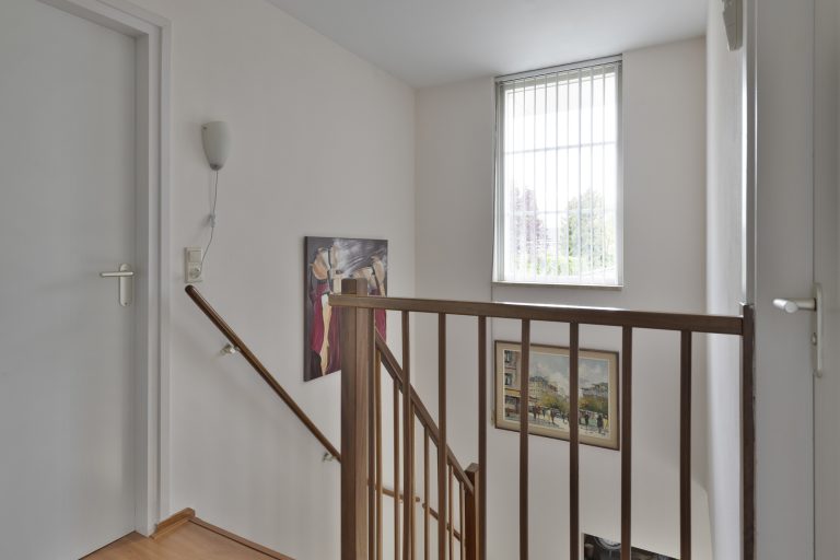 Overloop met natuurlijke lichtinval middels raampartij in zijgevel, aansluitend drie slaapkamers en een ruime moderne badkamer. De gehele verdieping is v.v. een laminaatvloer die naar alle slaapkamers is doorgelegd.