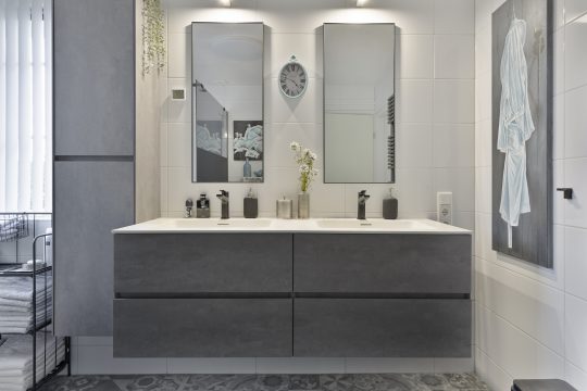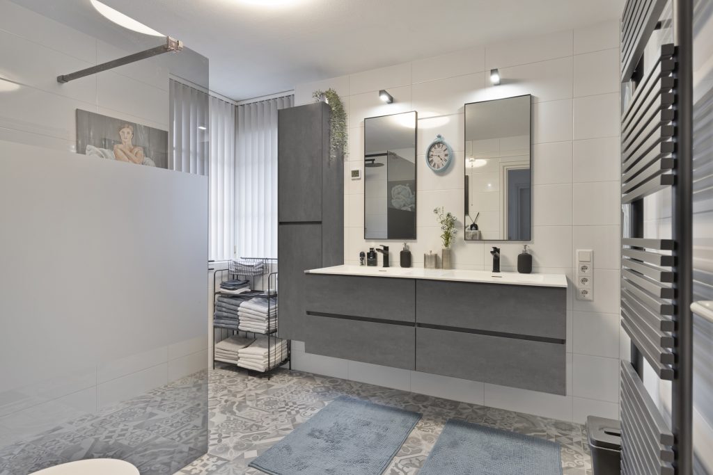 Moderne en geheel betegelde badkamer voorzien van ruime inloopdouche met glazen douchewand, dubbele wastafel met bijpassend meubel en spiegels, design radiator en een zwevend toilet.