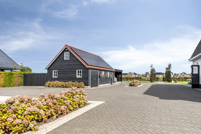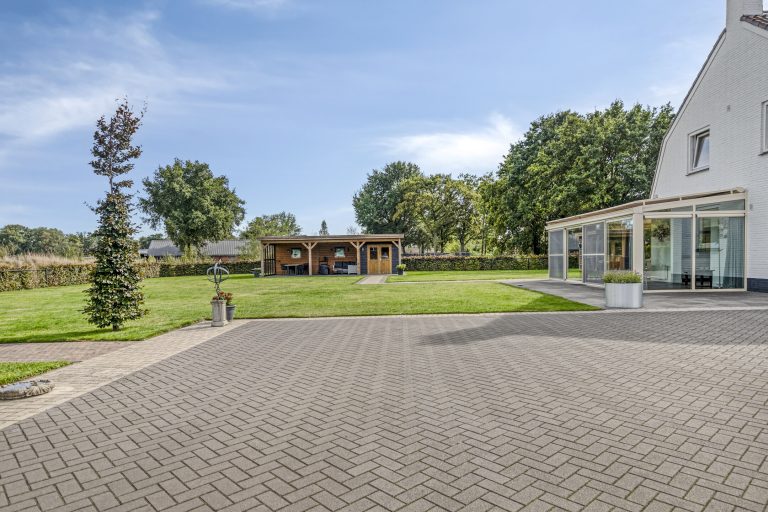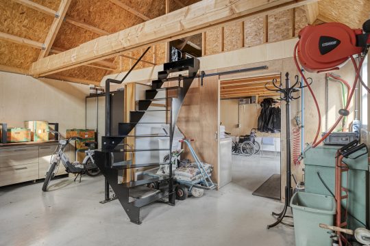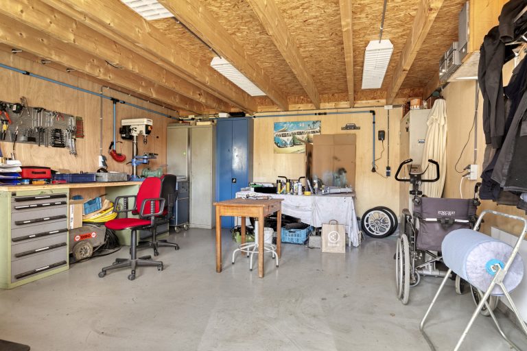 Garage: Aan de linkerzijde van het perceel bevindt zich de volledig bestrate oprit en de ruime garage met verdieping. De garage bestaat uit een garagegedeelte en een bergingsgedeelte, met een trap naar de zolderverdieping en is voorzien van elektra en verwarming. Aansluitend aan de garage bevindt zich de carport, die plaats biedt voor twee auto’s.