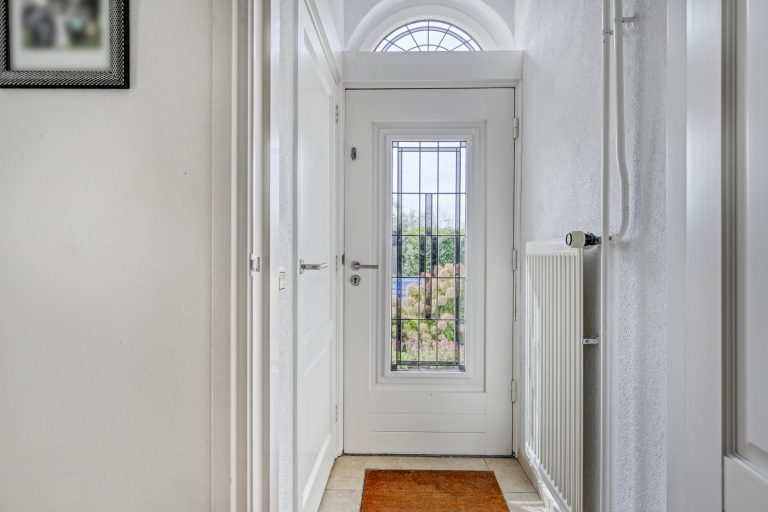 Vanuit de keuken is er toegang tot het achterportaal met kelderkast en deur naar de tuin en de oprit.