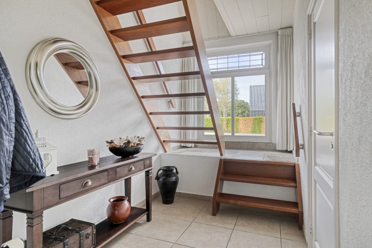 Tussenportaal met trapopgang naar de verdieping en toegang tot de badkamer.
