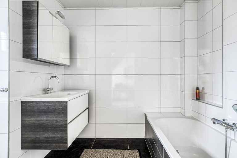 Moderne, geheel betegelde badkamer voorzien van ligbad, wastafelmeubel met bovenkast en inloopdouche met regendouche.