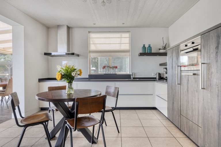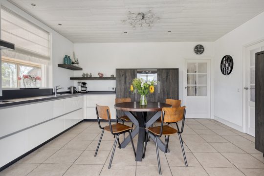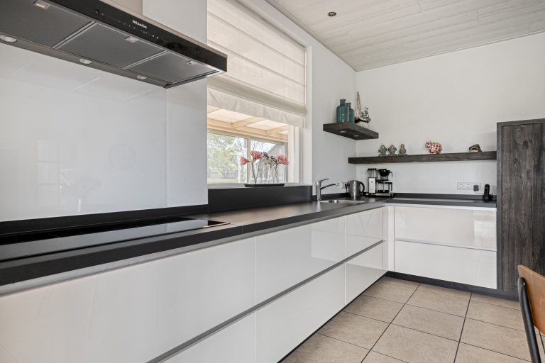 Moderne semi-open keuken voorzien van een luxe keukenopstelling, inclusief hoge kastenwand met koelkast, combi-oven en vaatwasser. Verder is de keuken uitgerust met een werkblad, spoelbak met mengkraan, inductiekookplaat en afzuigkap.