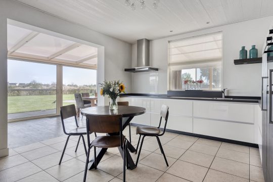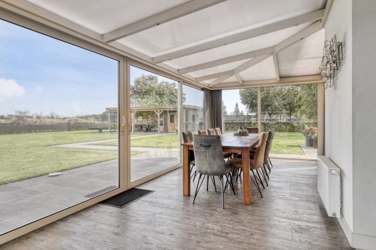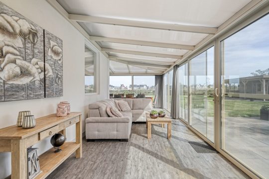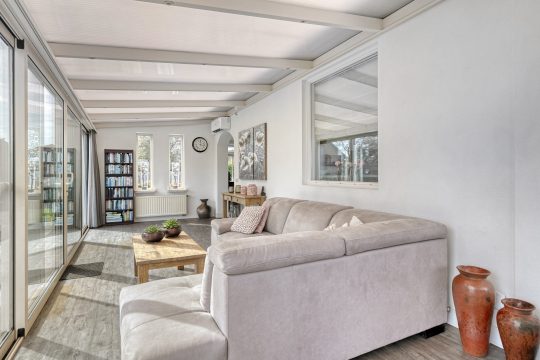 Lichte serre, toegankelijk vanuit zowel de woonkamer als de keuken. Voorzien van twee schuifpuien en een prachtig uitzicht op de tuin. De vloer is afgewerkt met pvc vloer.