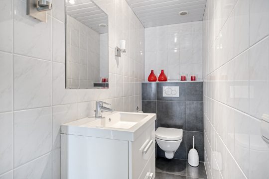 Geheel betegelde toiletruimte voorzien van wandcloset en wastafelmeubel.
