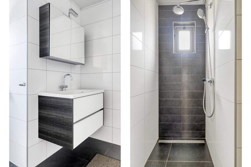Geheel betegelde toiletruimte voorzien van wandcloset en wastafelmeubel.