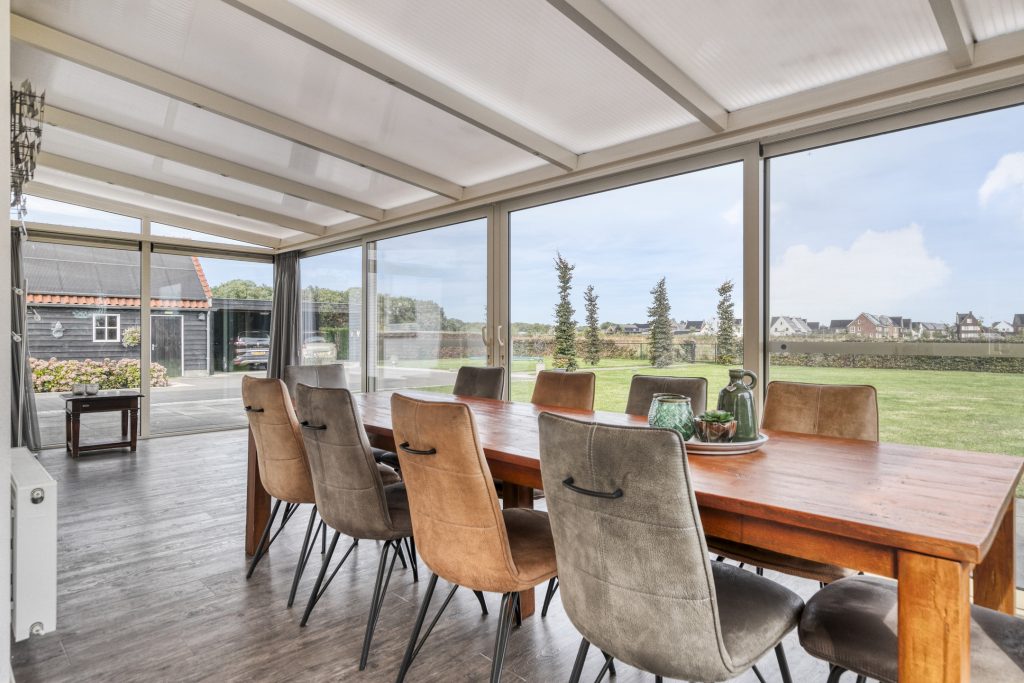 Lichte serre, toegankelijk vanuit zowel de woonkamer als de keuken. Voorzien van twee schuifpuien en een prachtig uitzicht op de tuin. De vloer is afgewerkt met pvc vloer.